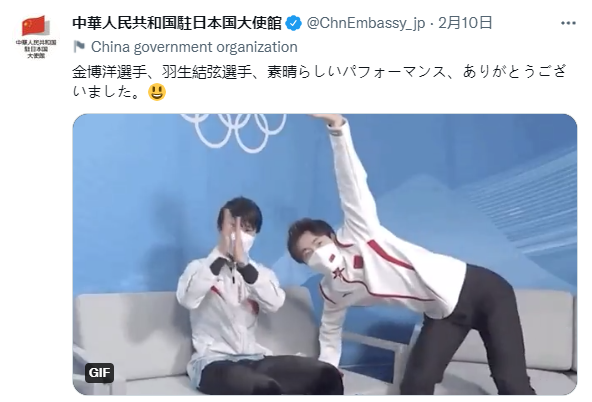 據環球時報報道,昨天(14日),中國駐日本大使館表示,金博洋和羽生結弦的友好互動在中日引發熱議,充分説明了兩國民眾對北京冬奧會的高度關注和對冰雪運動的共同熱愛。大使館表示,兩位優秀花滑運動員在比賽中勇於超越自我,挑戰競技極限,在賽場外相互鼓勵借鑑,共同進步成長,以實際行動詮釋了更高、更快、更強、更團結的奧林匹克精神,也共同書寫了冬奧會上的中日友好動人佳話,他們的友誼令人稱道。