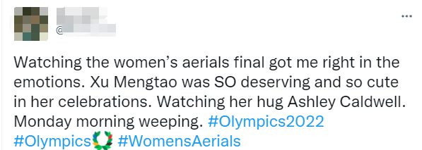(觀察者網訊)“這才是奧運本來的樣子!”昨晚,中國運動員徐夢桃奪得自由滑雪女子空中技巧金牌後,與位列第4名的美國運動員阿什利·考德威爾(Ashley Caldwell)緊緊擁抱的一幕感動了世界。