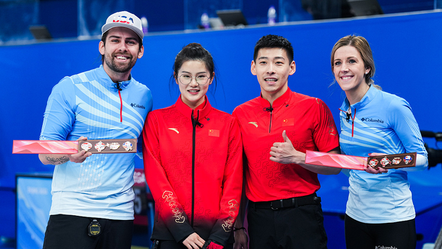 5日,冬奧會冰壺混雙循環賽第八輪,中國組合凌智/範蘇圓5-7不敵美國組合佩辛格/普利斯,比賽結束後,中國隊兩名選手親手將兩盒冰墩墩徽章贈予對手。