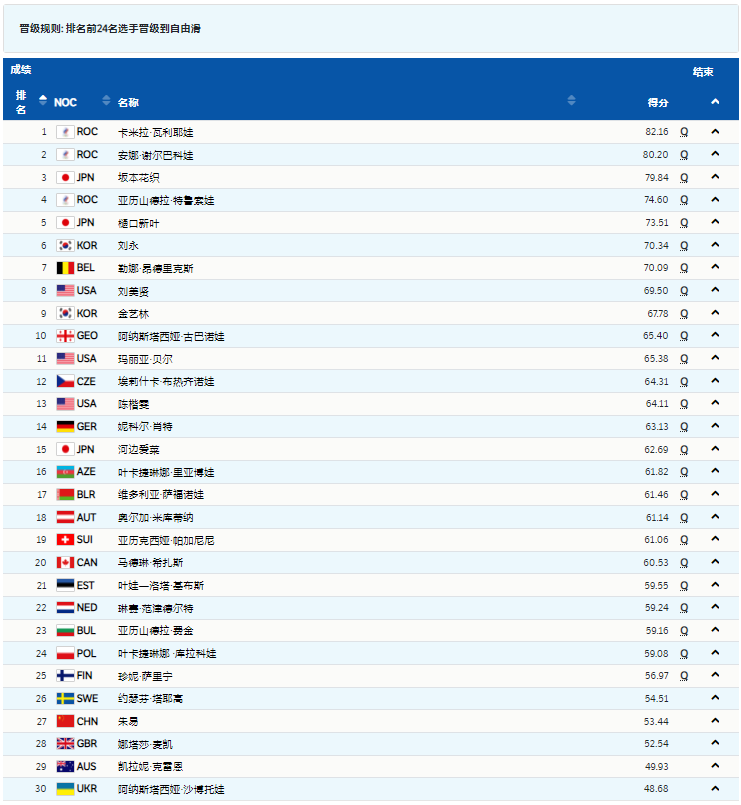 排名第二的是俄羅斯奧委會隊選手謝爾巴科娃,她滑出了80.20分;日本選手坂本花織得到79.84分,排名第三;俄羅斯奧委會隊選手特魯索瓦滑出74.60分,位居第四。