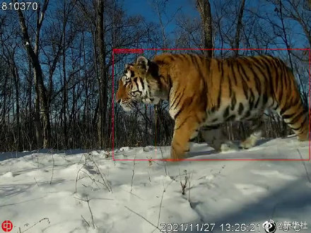 2021年11月27日,黑龍江東京城林業局野生動物監測系統拍攝到“完達山1號”,其運動及行為狀態良好,與其他監測到的健康野生東北虎無異。 圖源:@新華社