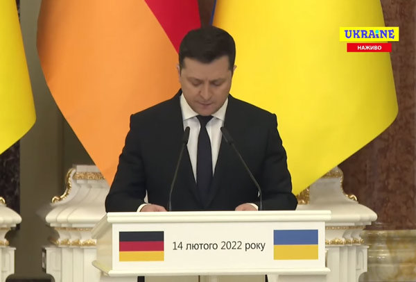 14日,烏克蘭總統澤連斯基與到訪的德國總理朔爾茨舉行聯合記者會。他在講話中不點名地批評美國,稱一些國家西遷使館人員的做法是個“巨大的錯誤”。圖為記者會現場視頻截圖
