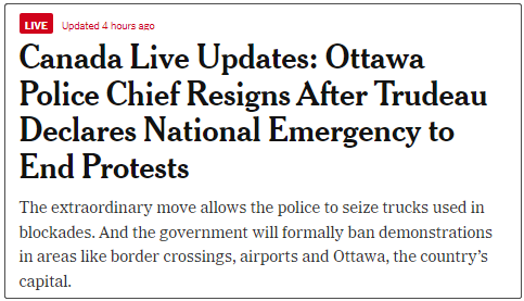 在特魯多頒佈了《緊急情況法》後,渥太華警察局長辭職。來源:《紐約時報》