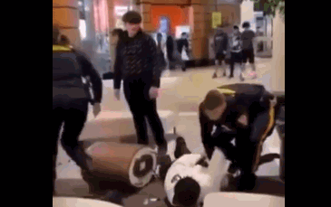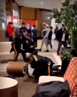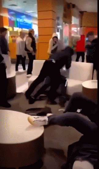 視頻中,一羣年輕人在商場的休息區聚集。一個白人小夥和一個黑人小夥扭打成一團。上前制止的兩名警察在將兩人拉開後,卻在第一時間共同用膝蓋將黑人按在地上,戴上手銬,無視了同樣參與打架的白人。