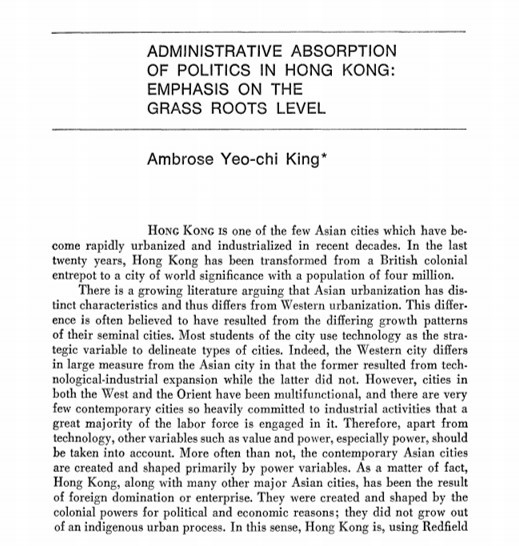“經濟城市論”者經常引用金耀基教授的“行政吸納政治”,認為在英殖時期,政治已被行政吸納,自然就不存在政治了。