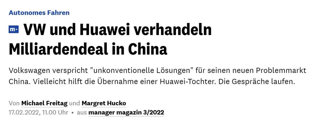 路透社中文版的報道是:“據經理人雜誌(Manager Magazin)週四報道,德國大眾汽車正在與中國華為公司進行談判,有意以數十億歐元收購華為的自動駕駛部門。經理人雜誌援引內部消息人士的話稱,集團高層已經就這筆交易進行了數月的談判,其中還涉及到大眾汽車並不擅長的技術系統。”
