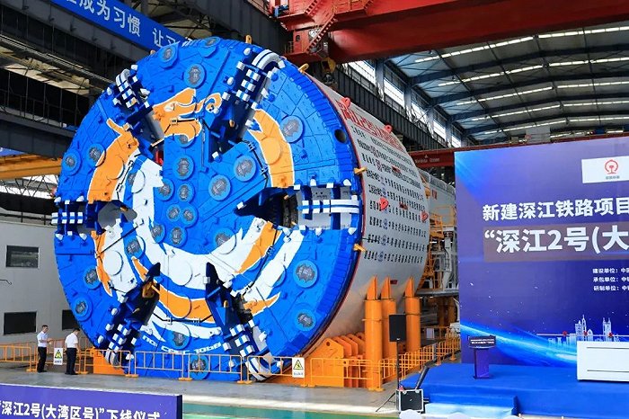 除了這幾個創造了“之最”的傢伙,還有參與深江鐵路重點控制工程——珠江口隧道的“深江1號”。它總長130米,總重3800噸,裝機總功率9010千瓦,開挖直徑13.42米。刀盤上塗的醒獅,是廣東地區文化發展的獨特代表。