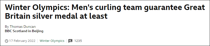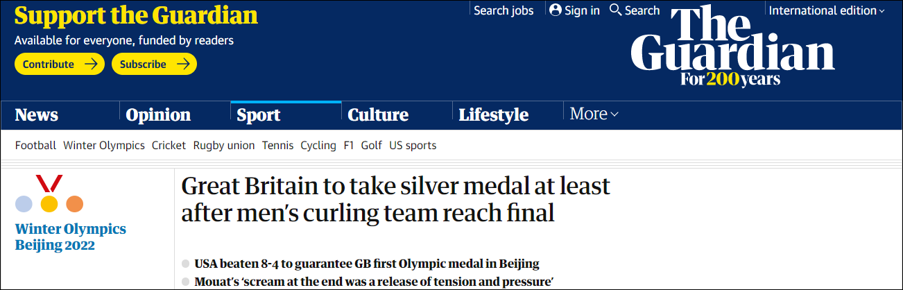 例如,《衞報》就在17日發佈了一篇標題為“在男子冰壺隊進入決賽後,英國至少獲得了銀牌”的報道,並在文章第一段感慨:“他們花了將近兩週的時間。在經歷了幾次痛苦的失敗和無數的挫折之後,英國代表團終於確保獲得了本屆冬奧會的首枚獎牌。”