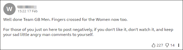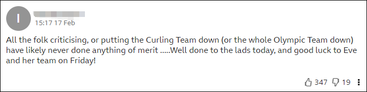 “所有批評或貶低冰壺隊(或整個冬奧代表隊)的人很可能從來沒有做過任何有價值的事情….. 今天小夥子們做得很好,也祝伊芙(英國女子冰壺隊隊長)和她的團隊週五好運!”