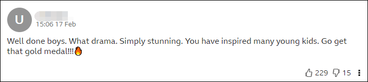 因此,此次英國男子冰壺隊成功打進決賽,英媒很難不感嘆獎牌來之不易。同時,許多英國網民也忍不住在報道評論區為男子冰壺隊歡呼,並祝願17日晉級半決賽的英國女子冰壺隊在接下來的比賽中取得好成績。