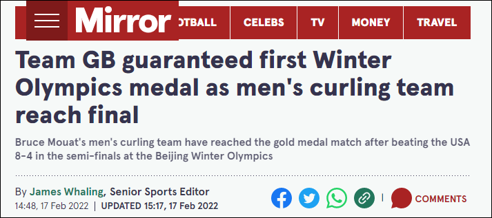 《鏡報》也是如此,不僅在標題中言明,“當男子冰壺隊進入決賽,英國隊確保了第一枚冬奧會獎牌”,更是在文章最後坦言,在此前的一系列賽事中,希望獲得獎牌的英國選手們都大失所望,但這次的勝利將“確保英國隊不會在30年來首次空手而歸”。