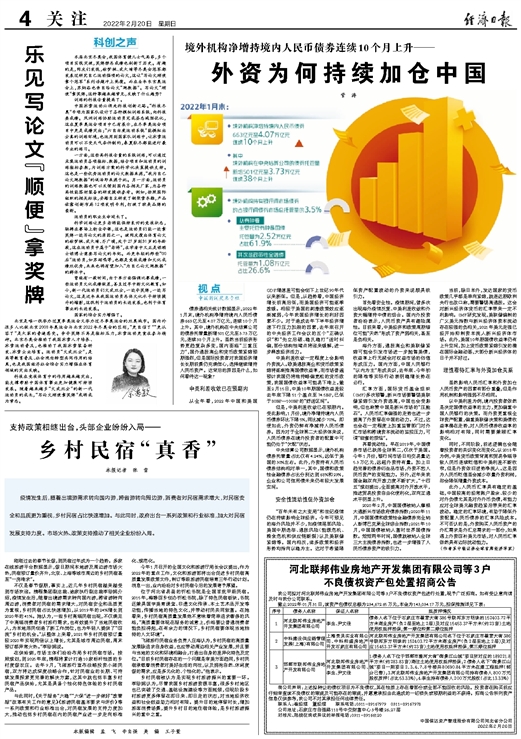 債券通相關統計數據顯示,2022年1月末,境外機構淨增持境內人民幣債券663億元至4.07萬億元,連續10個月上升。其中,境外機構在中央結算公司的債券託管量新增501億元至3.73萬億元,連續38個月上升。雖然當前經濟形勢更趨複雜多變,國內面臨“三重壓力”,國外通脹高企和貨幣政策緊縮預期強烈,但是國際投資者對我國經濟增長長期前景仍充滿信心,選擇繼續增持人民幣資產。這背後的原因是什麼,如何看待這一現象?