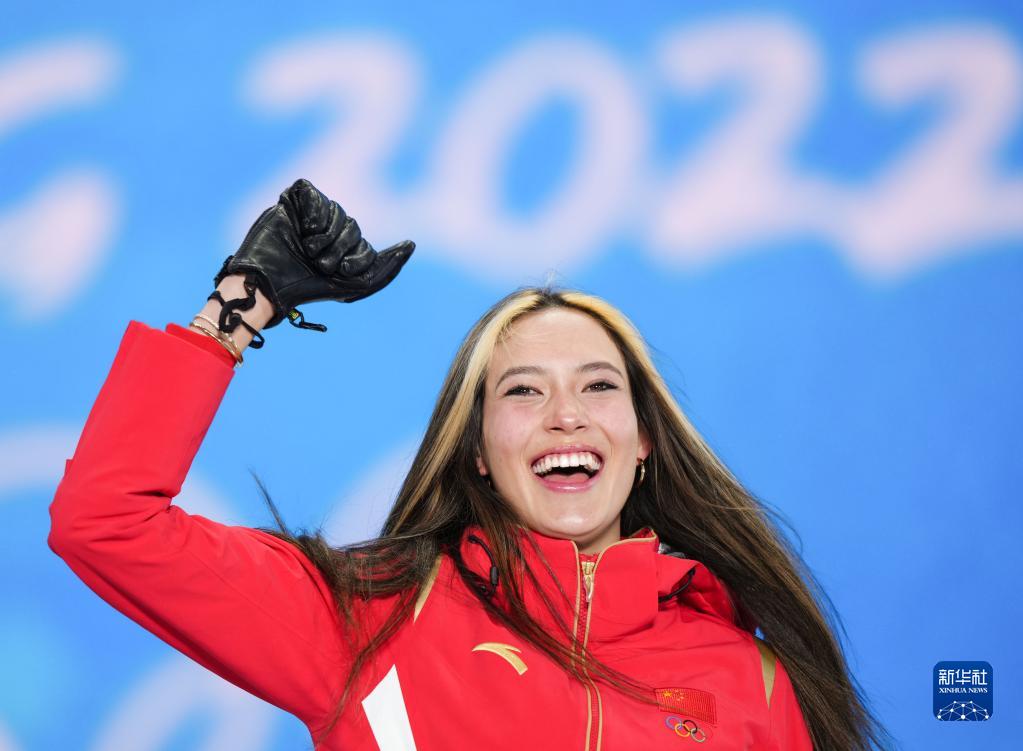 2月18日,冠軍中國隊選手谷愛凌在自由式滑雪女子U型場地技巧獎牌頒發儀式上。新華社記者薛玉斌攝
