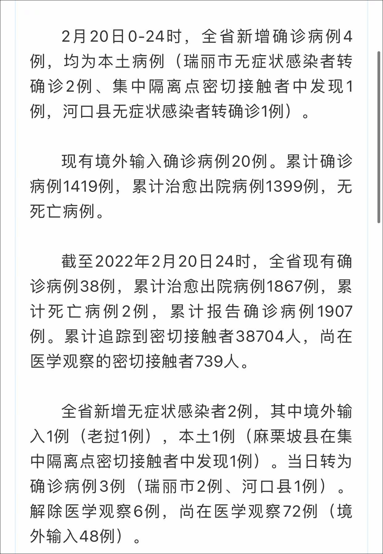 據云南衞健委微信公眾號2月21日消息,2月20日0-24時,雲南省新增確診病例4例,均為本土病例(瑞麗市無症狀感染者轉確診2例、集中隔離點密切接觸者中發現1例,河口縣無症狀感染者轉確診1例)。
