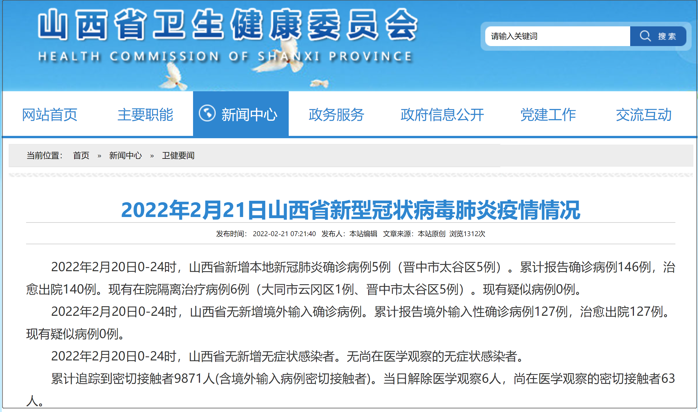 2022年2月21日,山西省新型冠狀病毒肺炎疫情情況。來源:山西衞健委