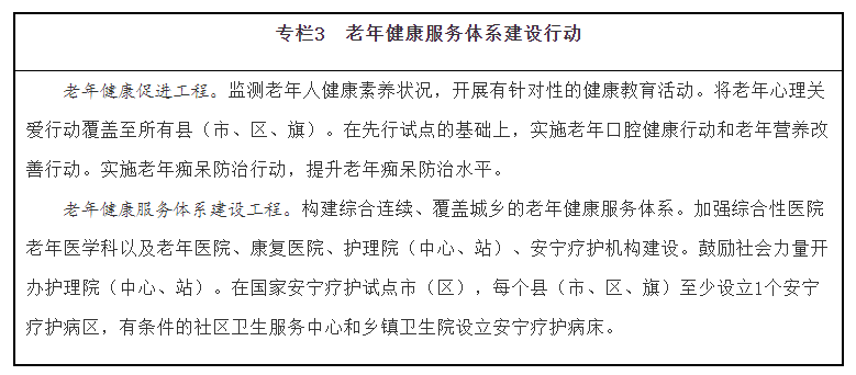 增強醫療衞生機構為老服務能力。加強國家老年醫學中心建設,佈局若干區域老年醫療中心。加強綜合性醫院老年醫學科建設。支持醫療資源豐富的地區將部分公立醫療機構轉型為護理院、康復醫院。推動醫療衞生機構開展老年綜合徵管理,促進老年醫療服務從單病種模式向多病共治模式轉變。加快建設老年友善醫療機構,方便老年人看病就醫。