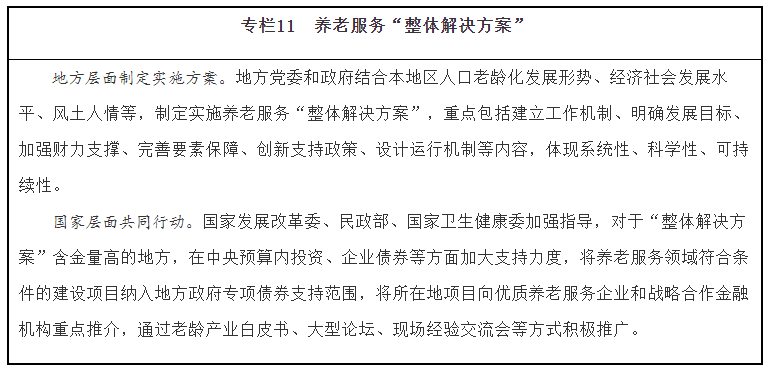 各省(自治區、直轄市)要根據人口老齡化發展形勢,制定實施專項規劃,加強與相關規劃銜接。各級老齡工作委員會要發揮統籌協調作用,推動老齡工作委員會各成員單位履職盡責,形成工作合力。發揮養老服務聯席會議制度作用,推進養老服務體系建設,強化區域養老服務資源統籌管理。支持城市羣、都市圈打造養老服務體系一體化建設格局,形成服務能力銜接、產業發展協同的合作區域。支持大型城市和區域中心城市推動養老產業集聚發展,充分發揮輻射帶動和示範作用。推動以地級行政區為單位制定“整體解決方案”,將老齡事業發展和養老服務體系建設納入經濟社會發展全局中通盤考慮,全方位整合資源力量,充分調動各方積極性,推動兜底性、普惠型、多樣化三種路徑協同發展。