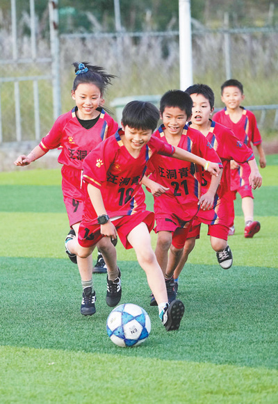 全民健身如火如荼,羣眾運動熱情高漲。圖為廣西壯族自治區柳州市融水苗族自治縣汪洞鄉,少兒足球隊隊員在比賽。 龍 濤攝(影像中國)