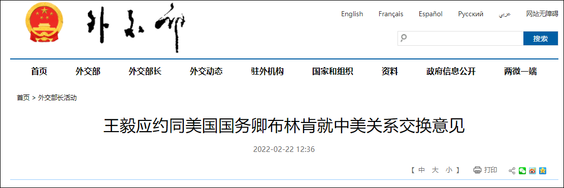 外交部網站消息,2022年2月22日,國務委員兼外長王毅應約同美國國務卿布林肯通電話。