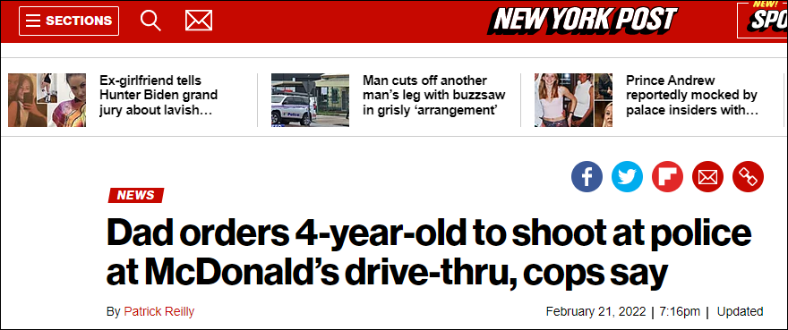 美國《紐約郵報》:警察説,父親命令4歲的孩子在麥當勞得來速餐廳向警察開槍