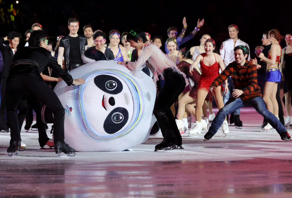 2月20日,“冰墩墩”不小心摔倒後,選手們紛紛上前幫忙。當日,北京2022年冬奧會花樣滑冰表演滑在首都體育館舉行。新華社記者 張玉薇 攝