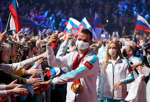 前往VTB競技場的路上,還有許多民眾專門來到街上,為運動員們歡呼。當天晚上,競技場內座無虛席,早些時候就抵達莫斯科的運動員也來到慶典台上。在約2000人的見證下,博利舒諾夫與謝爾巴科娃一同升起俄羅斯國旗,現場觀眾高唱國歌。俄副總理切爾尼申科感謝運動員們取得的成績,強調整個國家都為他們感到驕傲:“向你們深深鞠躬,俄奧會大隊的成員們。你們的表現證明了制裁、困難和限制使我們更加強大。你們打破了記錄,32枚獎牌!這是前所未有的。”