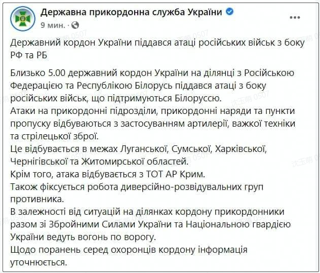 據烏克蘭邊防軍稱,早上5時左右,俄軍行動得到了白俄羅斯部隊支持,俄羅斯軍隊使用大炮、重型裝備和火器襲擊邊境部隊和檢查站。