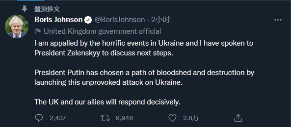 與此同時,約翰遜在個人推特號上也發表了一份簡短的聲明。除了表示自己已與澤連斯基通話外,他還譴責稱:“普京選擇了一條流血和毀滅的道路,對烏克蘭發動了這場無端的攻擊。英國和我們的盟友將作出果斷回應。”