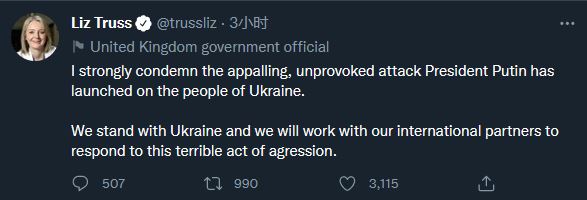 英國外交大臣麗茲·特拉斯在推特上表示:“我強烈譴責普京總統對烏克蘭人民發動的令人震驚的、無端的攻擊。我們與烏克蘭站在一起,我們將與國際夥伴合作,對這一可怕的侵略行為作出回應。”