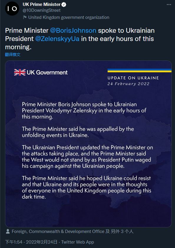 (觀察者網 訊)倫敦時間2月24日早晨,英國首相官方推特號就烏克蘭局勢發表聲明。