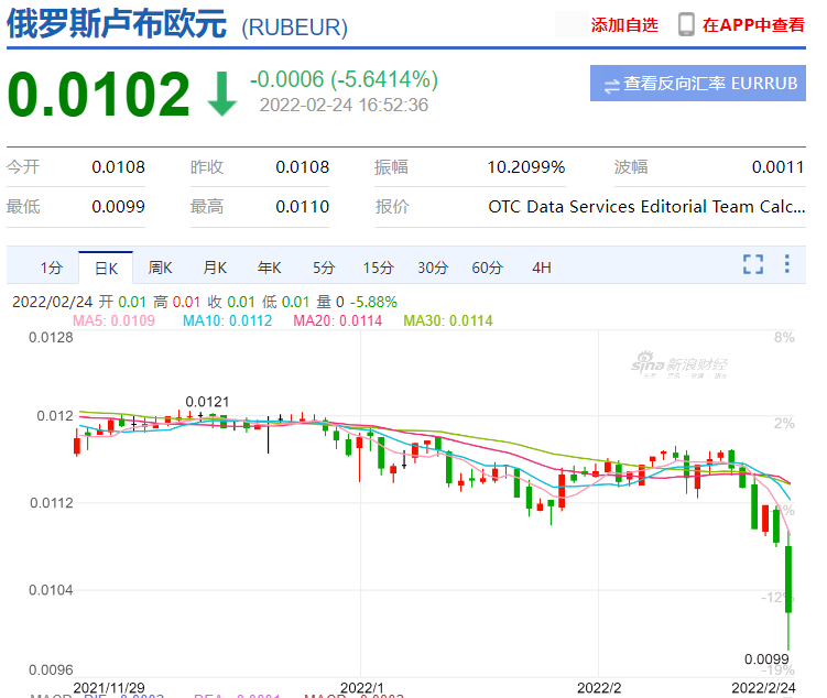 北京時間24日16時52分36秒,盧布兑歐元(RUBEUR)跌超5.64%,報0.0102。