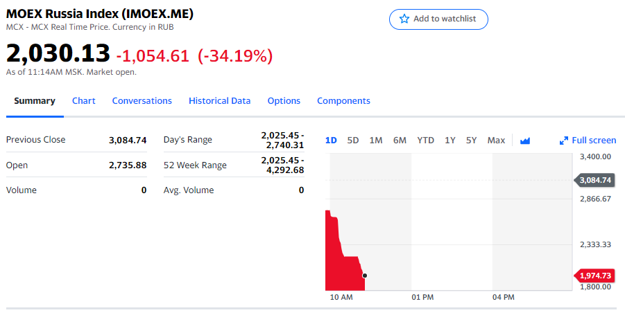 截止北京時間16時33分許,俄羅斯MOEX指數(盧布計價)暴跌34.19%