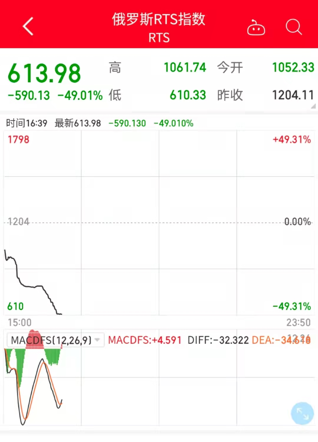俄羅斯交易系統指數(RTS,美元計價)今日開盤後一路下挫。北京時間24日16時39分許,俄羅斯RTS指數狂泄49.01%;北京時間今日17時32分許,俄羅斯RTS指數已經大幅拉昇,跌幅收窄至26.09%。