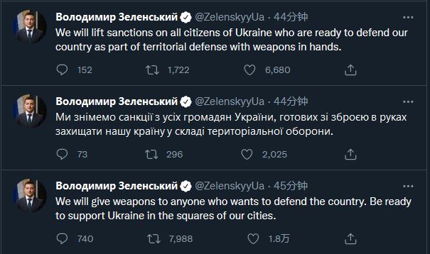 當地時間2月24日,澤連斯基在最新發布的幾條推特中呼籲稱,烏克蘭政府將會給那些願意保衞國家的民眾提供武器,準備好在各個城市支援烏克蘭。