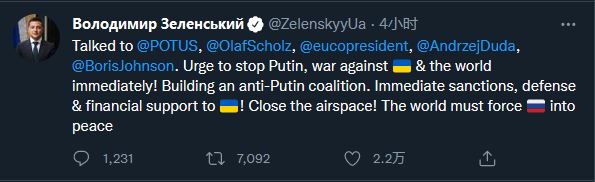隨後,澤連斯基在推特上宣佈,烏克蘭已經與俄羅斯斷交。他呼籲“俄羅斯尚未失去良知的人”,站出來抗議與烏克蘭的戰爭。