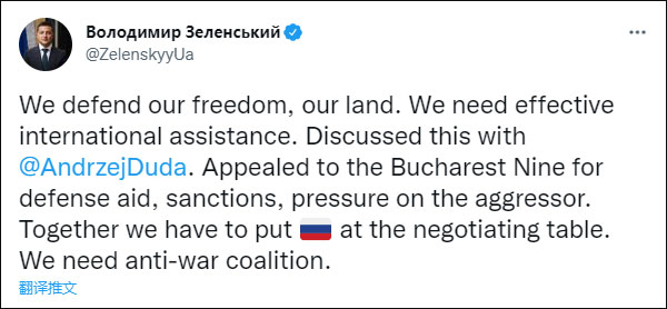 “我與波蘭總統安傑伊·杜達(Andrzej Duda)討論了這個問題。我向布加勒斯特九國呼籲國防援助,對‘侵略者’施加壓力。我們必須一起將俄羅斯帶到談判桌前”,澤連斯基週五在推特上寫道。