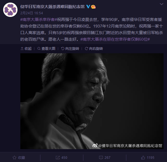 @侵華日軍南京大屠殺遇難同胞紀念館 消息,南京大屠殺倖存者祝再強於24日凌晨去世,享年90歲。南京侵華日軍受害者援助協會登記在冊在世的倖存者僅剩60位。