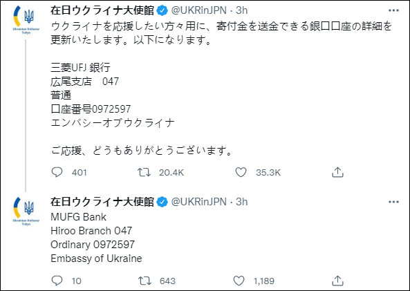 自此,烏克蘭駐日本大使館開始連發推特,懇請網民眾籌支援烏克蘭,並公佈了多個籌款銀行賬户。結果確實有不少日本網民紛紛表示會捐款,許多人還上傳了匯款截圖與照片。