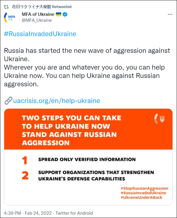 值得注意的是,在此期間,烏克蘭外交部發布了一條呼籲人們“幫助烏克蘭對抗俄羅斯侵略”的推文,並在推文內給出鏈接羅列幫助方式。其中一條提到,“你可以向烏克蘭軍隊和志願者提供財政支持”。烏克蘭駐日本大使館隨即轉發了這一推文。