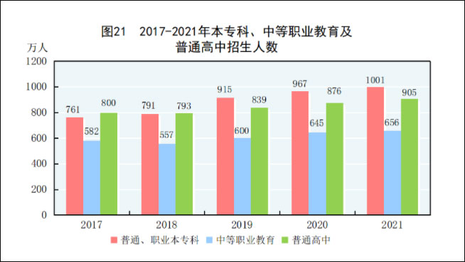 [65]普通、職業本專科包括普通本科、職業本科、高職(專科)。2021年高職(專科)招生人數統計口徑發生變化,包含五年制高職轉入專科招生人數。