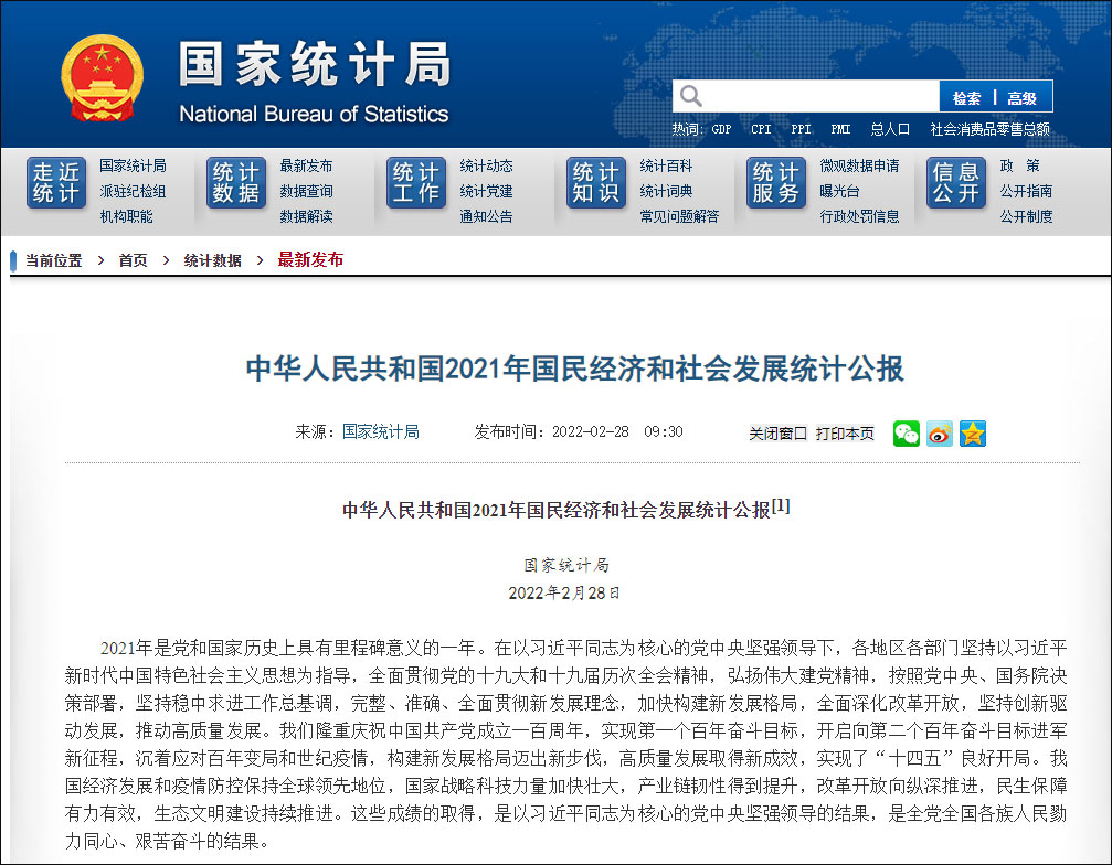 2月28日,國家統計局發佈了《中華人民共和國2021年國民經濟和社會發展統計公報》。