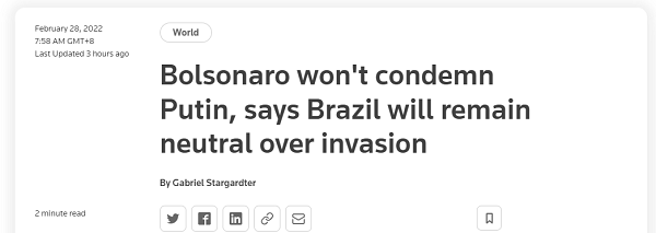 在27日記者會上,博索納羅表示,“我們不會挑邊站,我們會繼續保持中立。”關於是否會譴責普京的行動,他表示會等待最終報告的發佈,或視現在的局面將如何被化解,再給出他的看法。