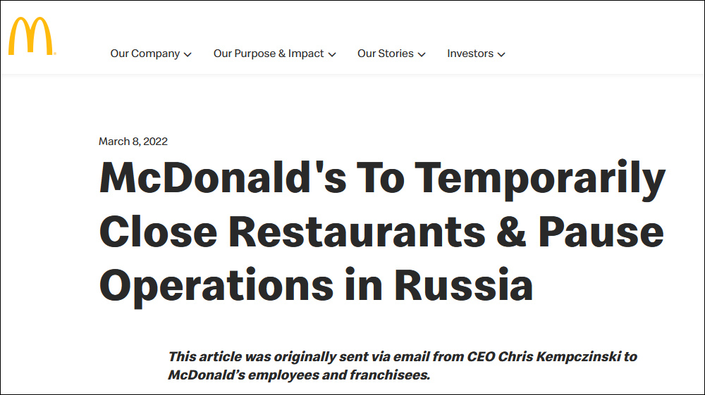 同一天,麥當勞也在其網站宣佈暫時關閉俄羅斯境內的850家門店,並暫停在該市場的所有業務。不過,麥當勞首席執行官克里斯·肯普辛斯基(Chris Kempczinski)表示,公司將繼續支付在俄6.2萬名員工的工資,旗下的麥當勞叔叔之家慈善基金(Ronald McDonald House Charities)也將繼續運營。