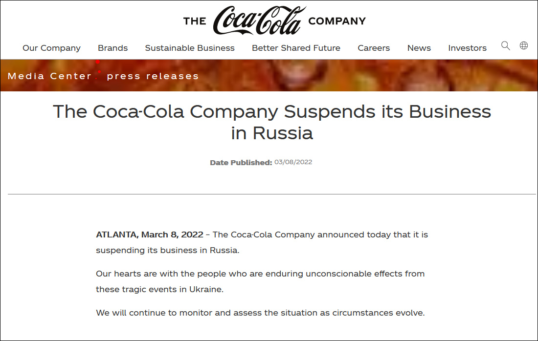 可口可樂的聲明相對簡短,僅提出將暫停在俄羅斯的業務。
