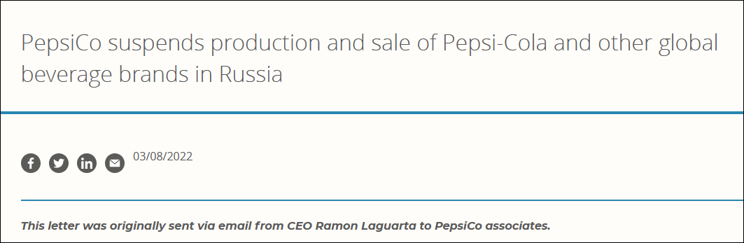 在俄羅斯經營了60餘年的百事可樂則宣佈,將暫停在俄羅斯銷售包括百事可樂、七喜、美年達在內的飲料品牌,並暫停當地的資本投資和所有廣告促銷活動。聲明稱,為了“堅持業務中人道主義的方面”,公司將繼續在俄供應包括日常必需品在內的其他產品,如牛奶和其他乳製品、嬰兒配方奶粉和嬰兒食品,以繼續支持2萬名員工和供應鏈中4萬名農業工人的生計。