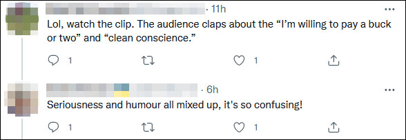 “重新看一遍視頻吧。這個笑點就在於他作為一個不用買汽油的電車車主,卻告訴別人他們不應該在乎油價。我不覺得他很好笑,但他確實在開玩笑。”