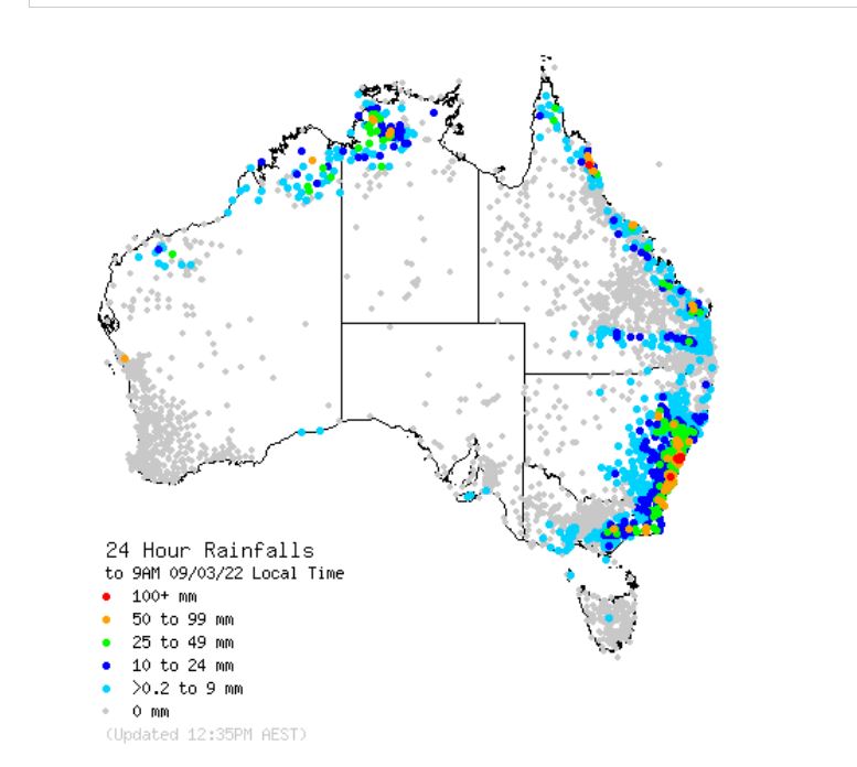 澳氣象局9日最新降雨圖顯示,澳東部新南威爾士州和昆士蘭州降雨量依舊很大