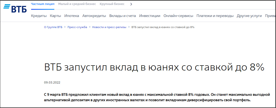VTB指出,新幣種存款業務將是其他外幣存款中最有利可圖的替代方案。面對不斷上漲的美元和歐元匯率,許多客户開始對投資其他貨幣感興趣,而人民幣是投資基金最實惠和最有前景的選擇之一。