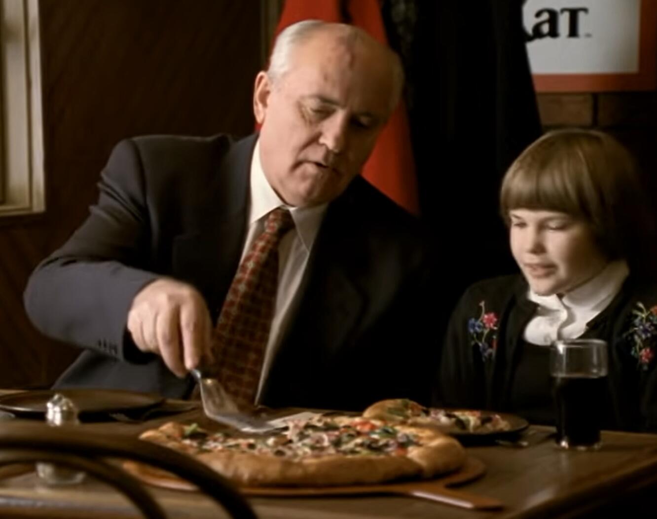 據悉,必勝客於90年代曾邀請最後一任蘇聯領導人米哈伊爾·戈爾巴喬夫為其拍攝一支廣告。廣告中,餐廳裏的食客們因戈爾巴喬夫的到來而爭吵,年輕人認為戈爾巴喬夫帶來了機會和希望,但中年人卻指責稱,他造成了經濟、政治和所有的混亂,最後一位老太太為結束爭論説到,得益於戈爾巴喬夫,我們有了必勝客。