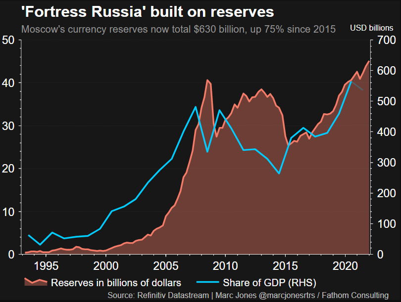俄羅斯外匯儲備(美元計價,紅線)及其GDP佔比(藍線) 路透社報道截圖